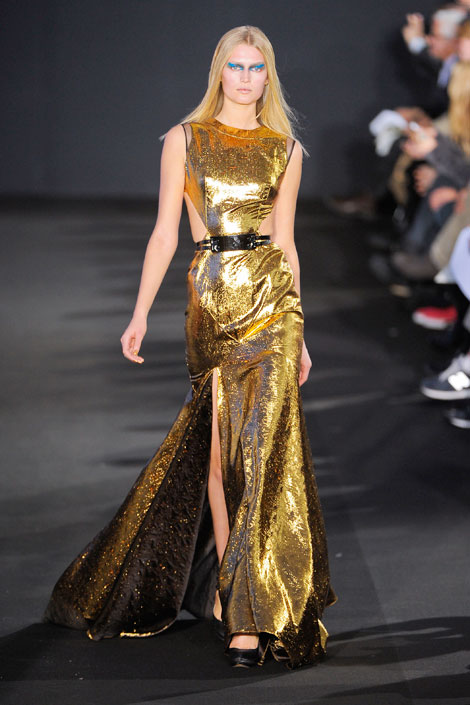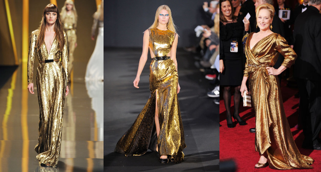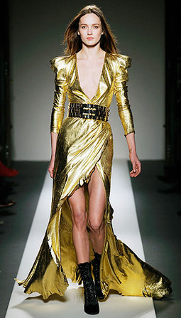 - A Balmain foi uma das pioneiras do vestido dourado nas passarelas. Com franjas, brocados, rendas – sempre muito sensuais. Fotos: The Frisky; Snob Fashion Source;